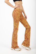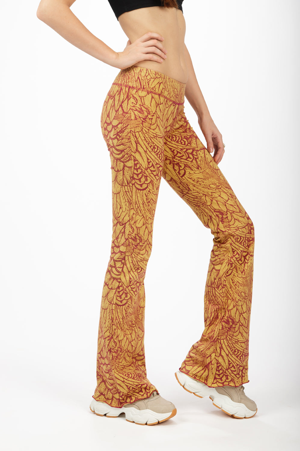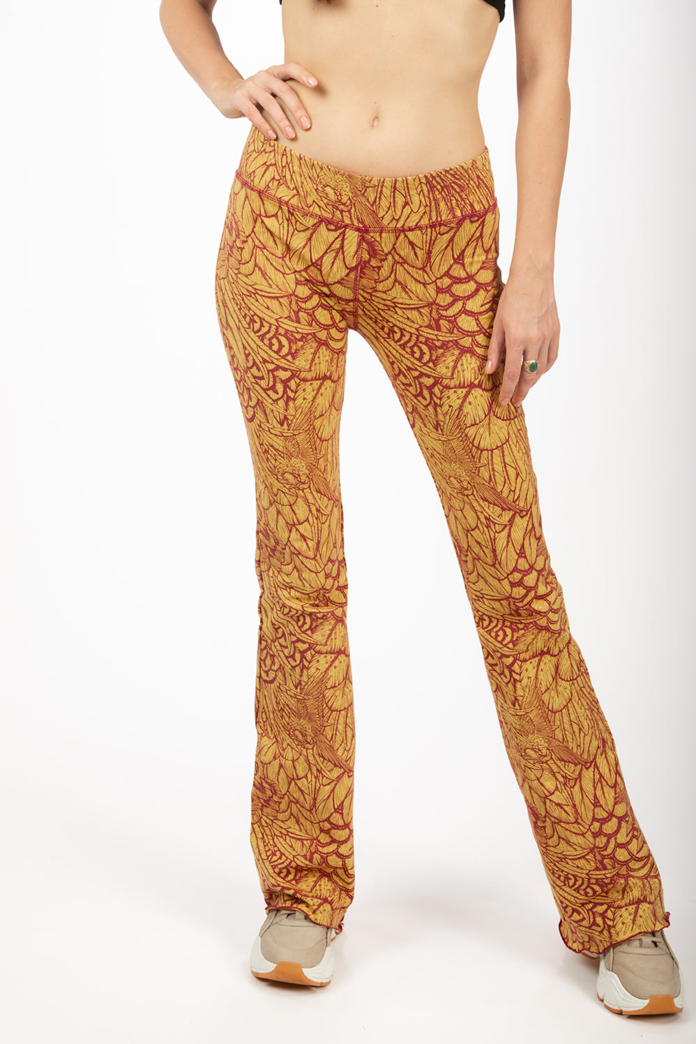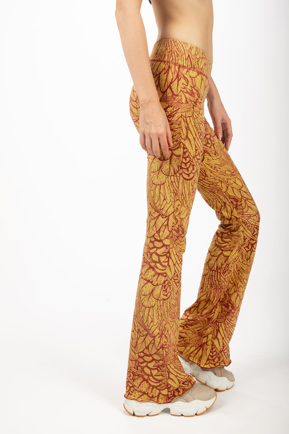 We offer you this limited edition mustard yellow flared leggings with our gorgeous Feather print in red. Our bootleg style pants come with a slight flare starting at the knee. These are available with a super-high waist band for keeping your love-handles in check or in the medium high waist. Both have great comfort and style.