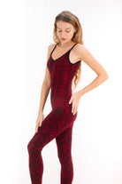 This red catsuit has a  black snake print, giving it a slinky, eye catching look. It's perfect for wearing on its own to show off your body, or paired with a mini skirt, shorts or a loose top. It is a simple and fantastic addition to your wardrobe. Funky Simplicity's catsuit red black snake print-unitard is ideal for wearing to your yoga or pilates class, for chilling in the house or for a night out clubbing as it holds its shape whatever you do.