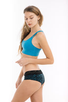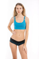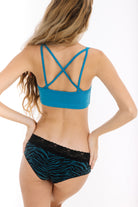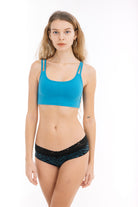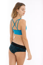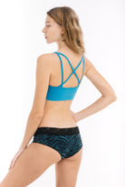 A wonderful turquoise sporty bra top with a cross-back strap back, with a built-in bra which is elasticated to offer extra support and coverage. This funky cross-back top is both perfect for smaller breasts and the perfect sports bra for women with bigger breasts, as it combines support with style.
