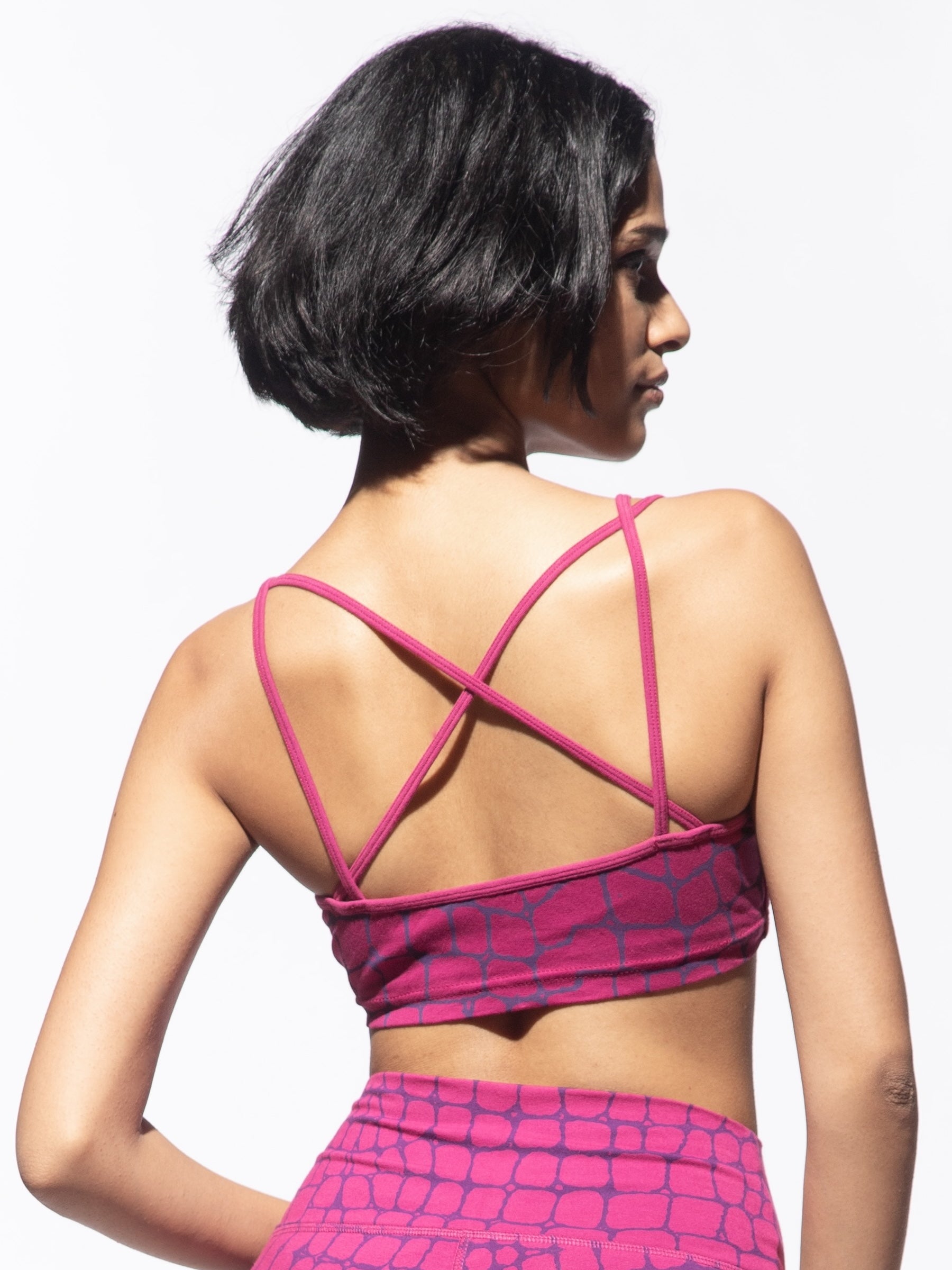 model wearing fuchsia purple crocodile bike shorts with cross back bra top with built in bra, shown from the back