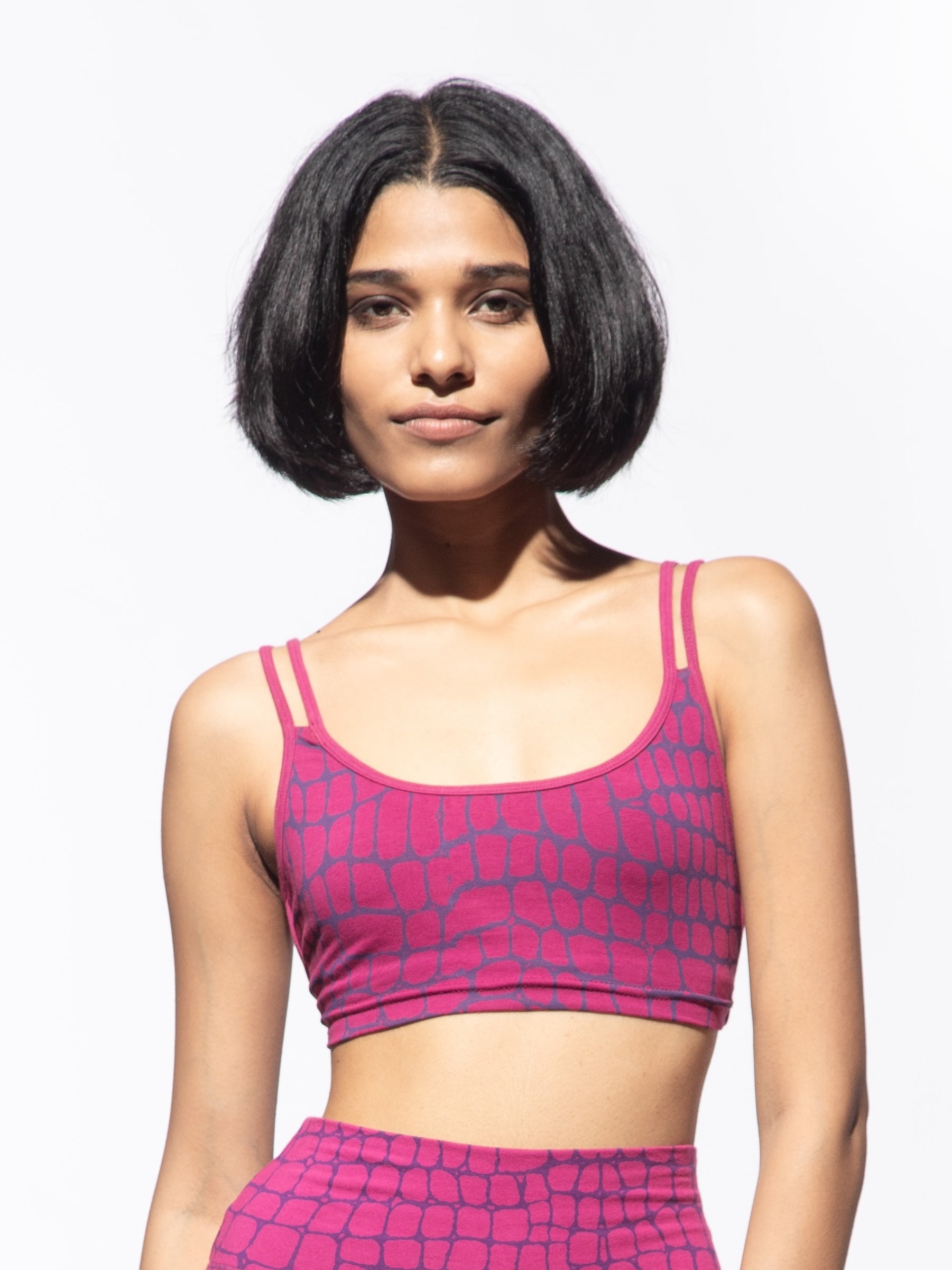 model wearing fuchsia purple crocodile bike shorts with cross back bra top with built in bra, shown from the front.
